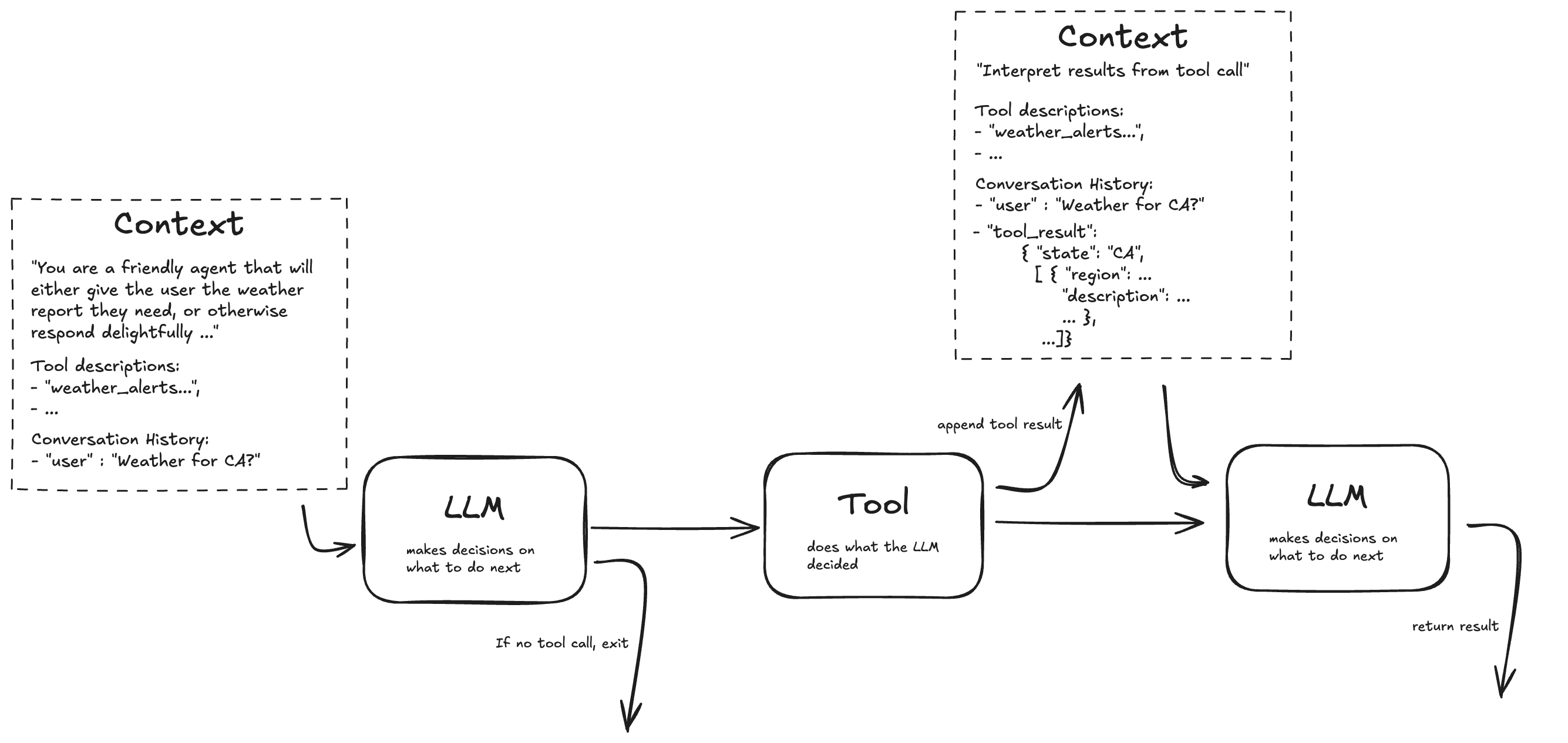 - and if a function has been called, the result is appended to the context that is then sent back to the LLM for interpretation (the LLM is instructed to format the tool response).
